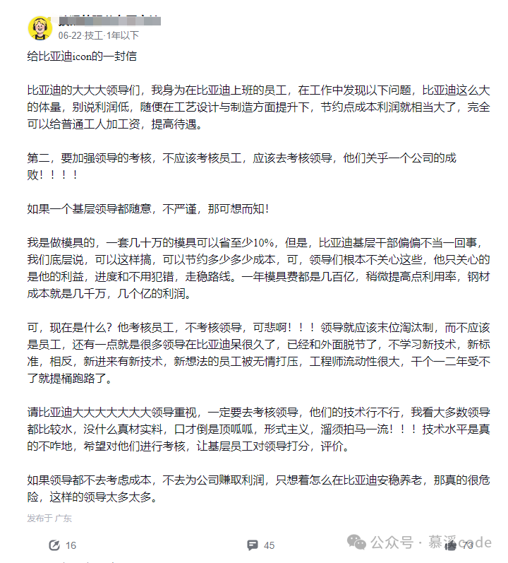 最近,一位比亚迪员工在脉脉上发帖,给公司领导写了一封“公开信”,吐槽公司在管理和成本控制方面存在的问题,并建议公司应该加强对领导的考核,而不是一味地压榨员工。