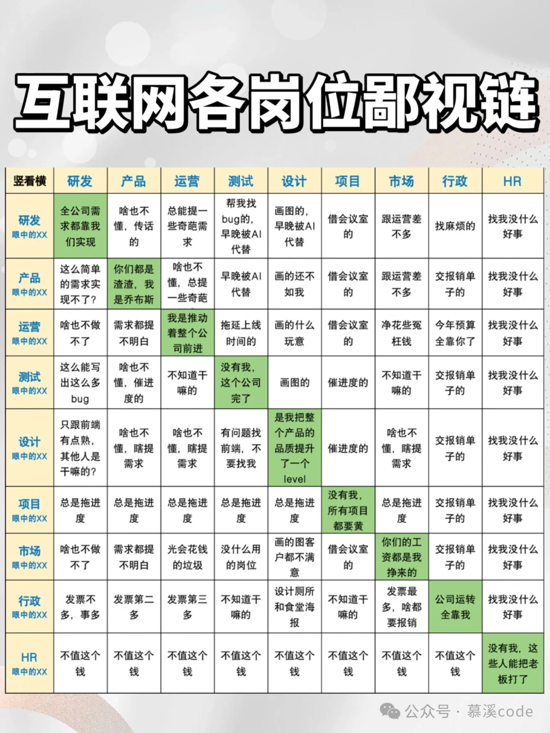 岗位鄙视链,简单来说,就是每个岗位都把自己视为最“核心”,而把其他岗位视为“配角”或甚至“拉后腿”的人,形成了一种“鄙视”的链条。从产品到开发,再到设计,测试,运营,每个环节无不充斥着这种“我最重要”的思维。然而,事实真的如此吗?