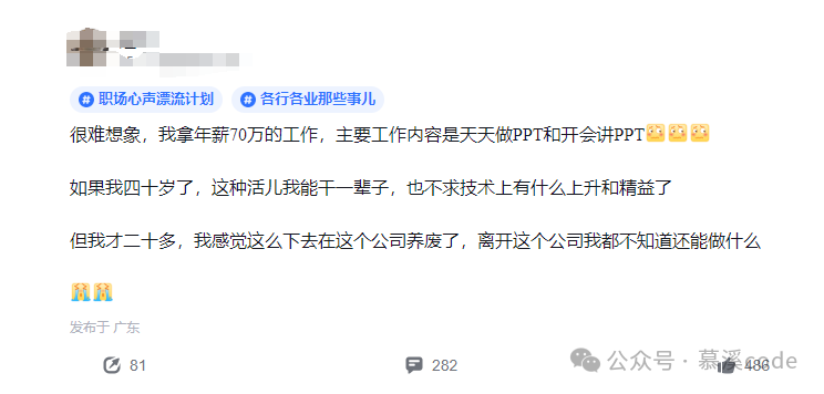 这位网友表示哈,虽然这份工作轻松稳定,但他却感到十分迷茫和焦虑。他认为自己才二十多岁,不应该把时间浪费在做PPT上,更担心自己离开这家公司后,会失去竞争力,不知道还能做什么呢。