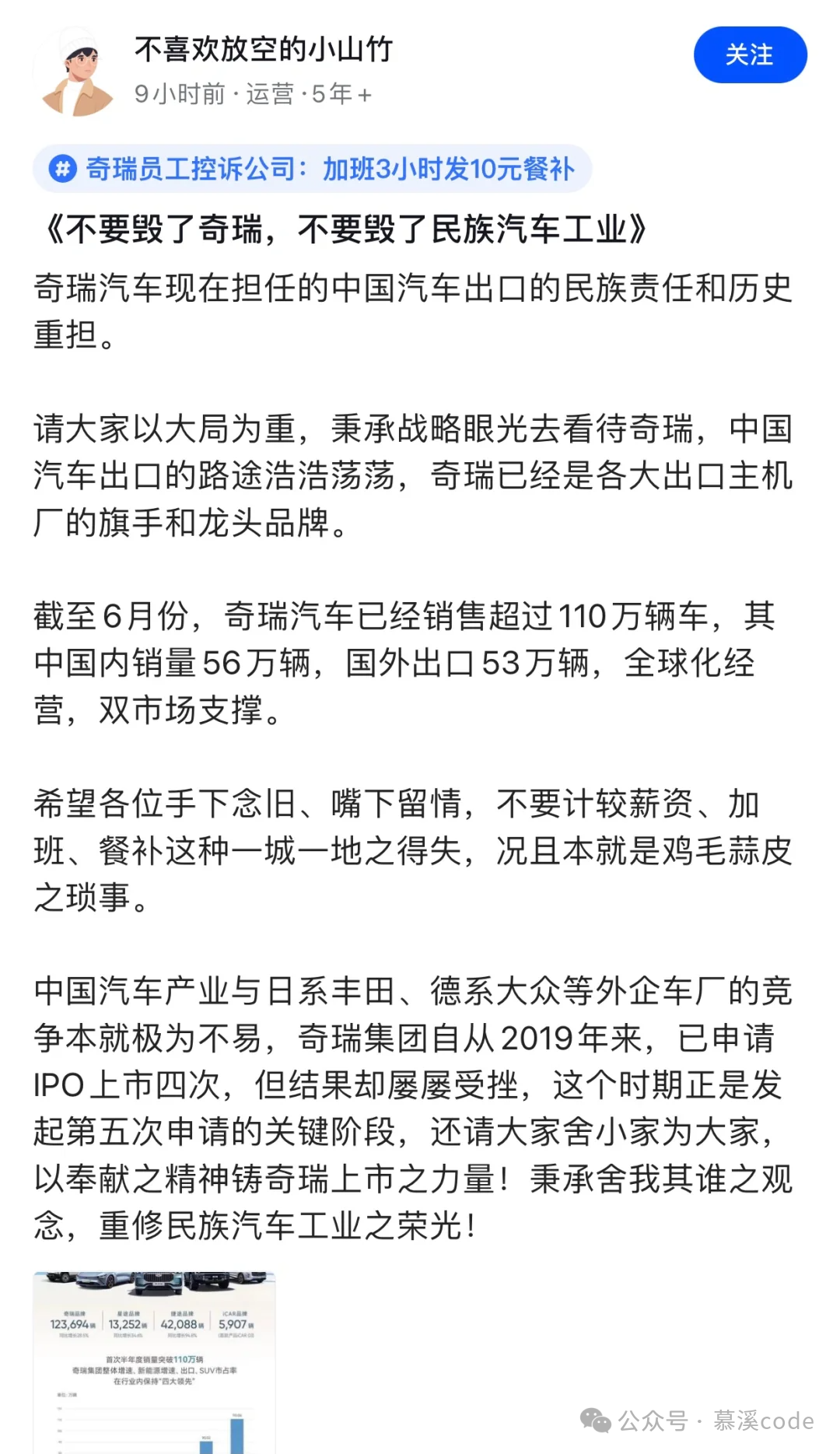 最近,奇瑞可谓是深陷舆论的漩涡,有关其员工加班、薪资待遇等问题在网络上持续发酵。就在这时,一篇名为《不要毁了奇瑞,不要毁了民族汽车工业》的文章横空出世,看似是在为奇瑞说话,实则却引发了更大的争议。