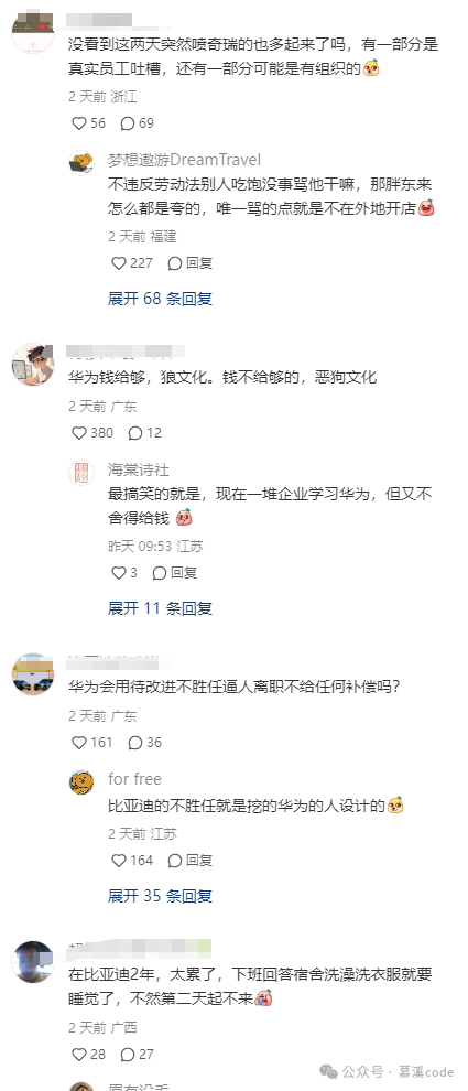 还有网友指出,华为的“狼性文化”虽然饱受争议,但人家是真给钱,而且舍得给钱!比亚迪只学了个皮毛,就想让员工拼命干活,这怎么可能呢?