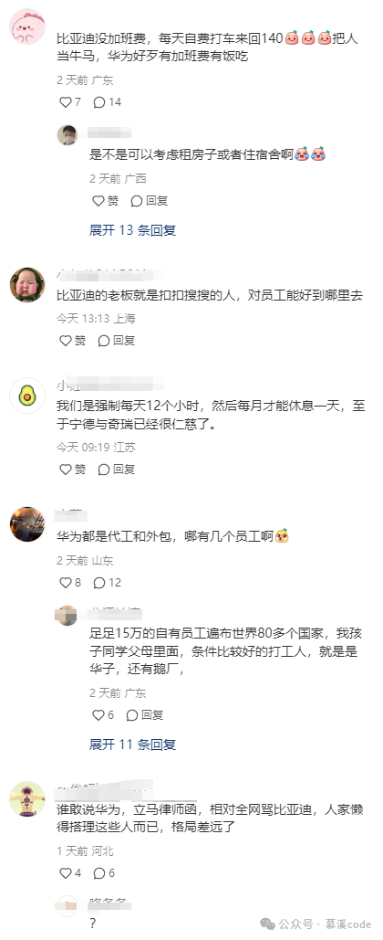 “华为好歹加班费给得足,饭也管饱,比亚迪呢?加班费没有,还得自费打车上下班,这待遇差得可不是一星半点!”一位网友吐槽道。
