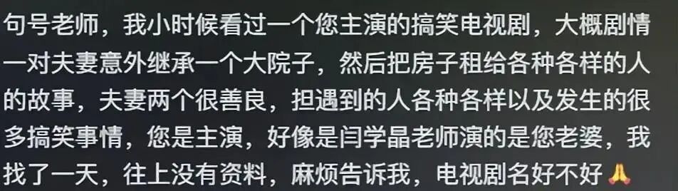 还有网友在问曾经句号老师的作品,“句号老师,我小时候看过一个您主演的搞笑电视剧,大概剧情一对夫妻意外继承一个大院子,然后把房子租给了各种各样人的故事,”