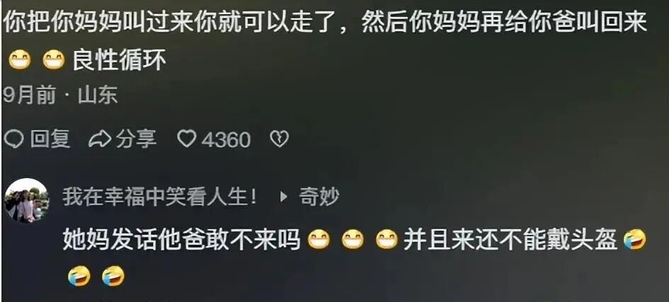 有不少网友看到之后都在评论区中“支招”,“你把你妈妈叫过来你就可以走了,然后你妈妈再给你爸叫回来,良性循环,”“她妈发话同台爸敢不来吗,并且来还不能戴头盔。”