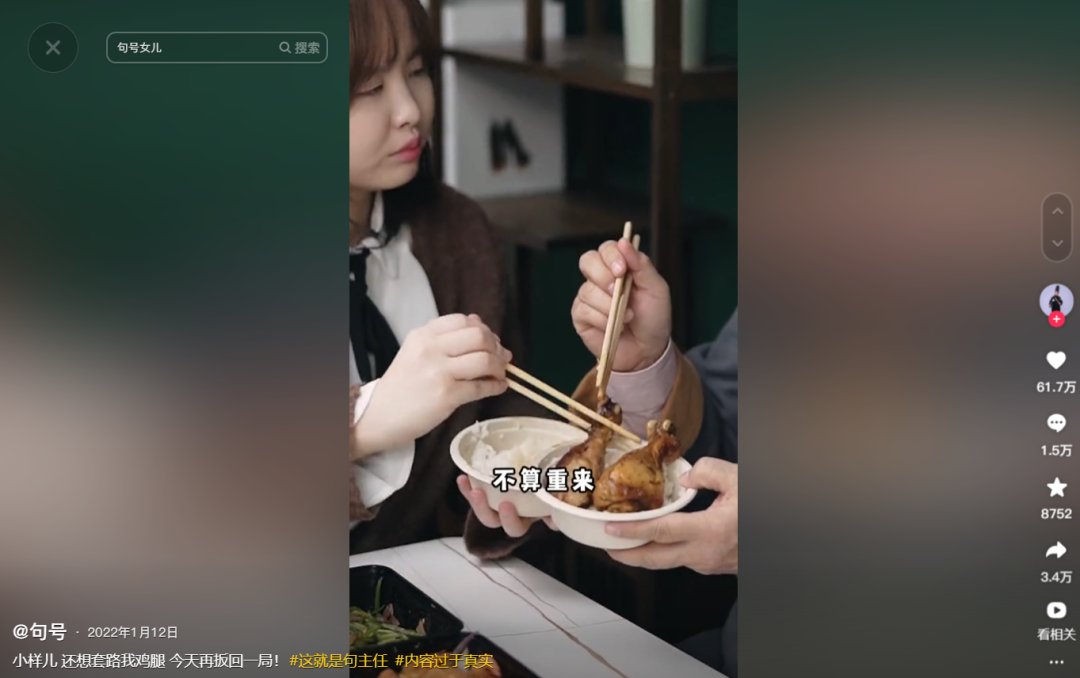 句号经常会在设计平台更新自己的日常生活,十分的有意思,在2022年的一期中他的女儿就露相了,他们在一张饭桌上吃饭,句号先是问到,“闺女,你吃鸡腿吗”,闺女在说不吃之后,句号直接去闺女的碗里把鸡腿给夹走了。