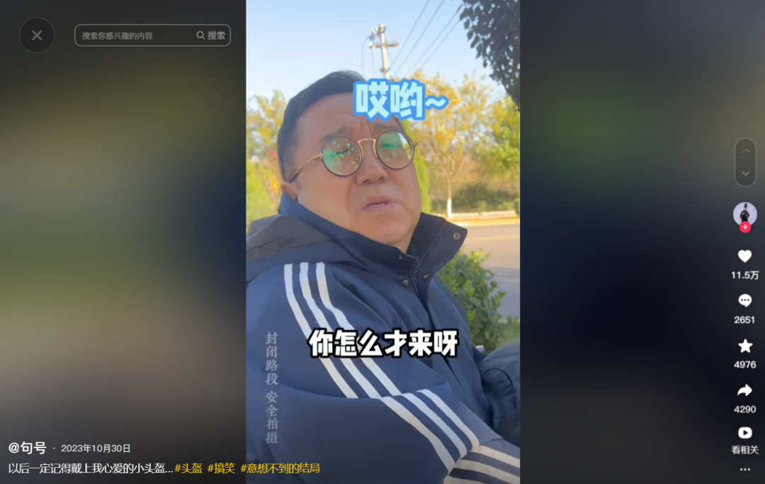 相信不少小伙伴在看的时候,都被逗的“哈哈大笑”,还有更有意思的,句号在一期视频中因为没有戴头盔而被交警给拦住了,需要找到下一个没有戴头盔的人才可以走。