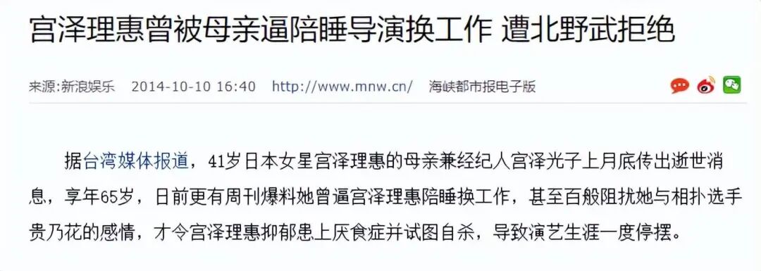 信息来源: 海峡都市报电子版2014-10-10——宫泽理惠曾被母亲逼陪睡导演换工作 遭北野武拒绝