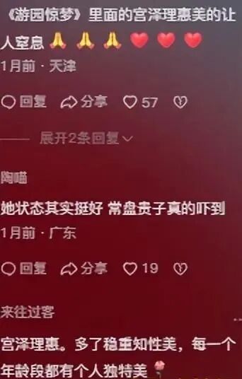 “《游园惊梦》里面的宫泽理惠美的让人窒息”,“她状态其实很好,常盘贵子真的吓到,”“宫泽理惠,多了稳重知性美,每一个年龄段都有个人独特美。”