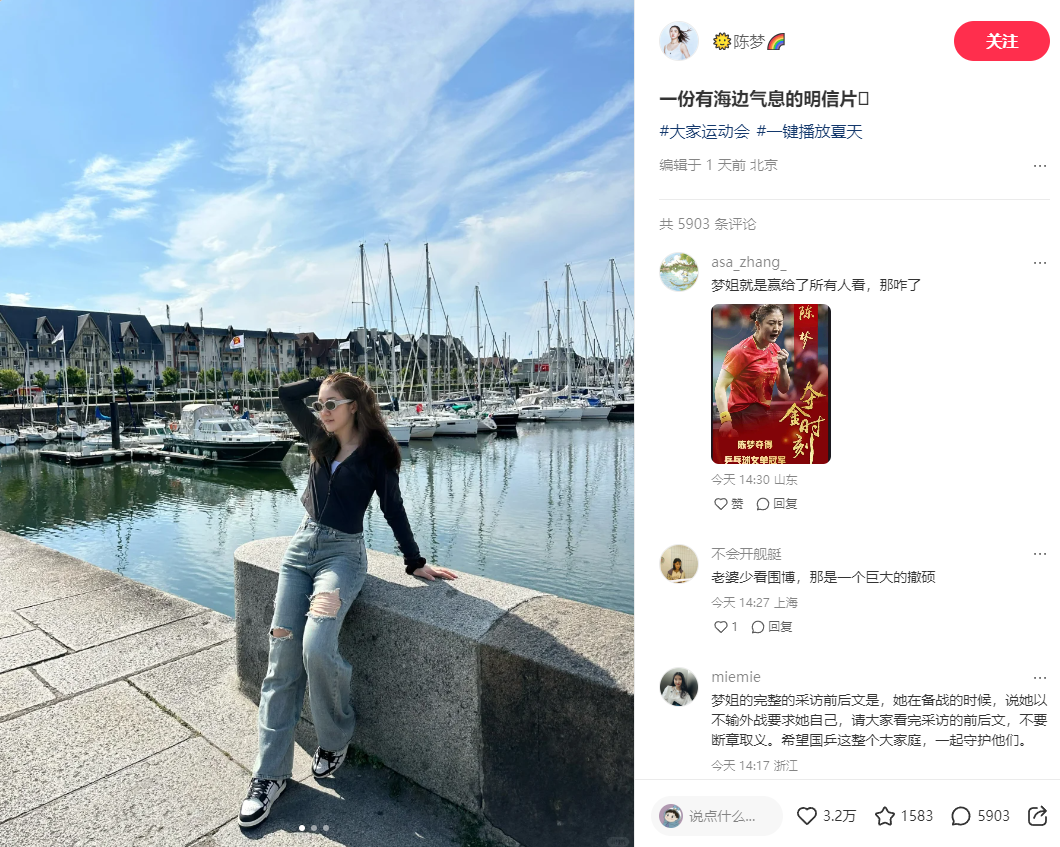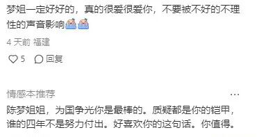 “梦姐一定好好的,真的很爱很爱你,不要被不好的不理性的声音影响,”“陈梦姐姐,为国争光你是最棒的,质疑都是你的铠甲,谁的四年不是努力付出,好喜欢你的这句话,你值得。”