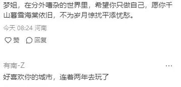 “梦姐,在分外嘈杂的世界里,希望你只做自己,愿你千山暮雪海棠依旧,不为岁月惊扰平添忧愁,”“好喜欢你的城市,连着两年去玩了。”