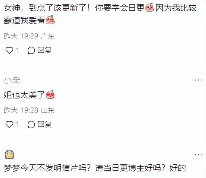 “女神,到点了该更新了!你要学会日更,因为我比较霸道我爱看,”“姐也太美了,”“梦梦今天不发明信片吗?请当日更博主好吗?好的”。