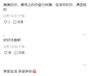 “美美的你,赛场上的你奋力拼搏,生活中的你,潇洒自如”,“好好休息啊,”“享受生活,多姿多彩。”