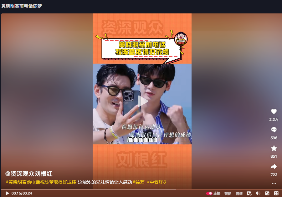 当时中餐厅录制期间的时候正是奥运的前夕,黄晓明作为陈梦的表哥,也没有忘记打电话送去祝福,“妹妹,我们就是很希望你能够取得好成绩,都很看好你,”紧接着还有身边和黄晓明一起在录制节目的明星一同说到加油加油。