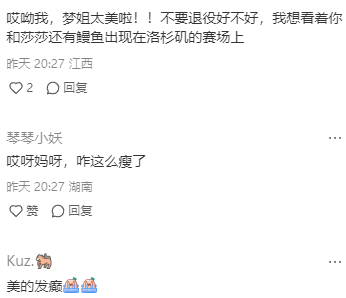 “哎呦我,梦姐太美了!!不要退役好不好,我想看着你和莎莎还有鳗鱼出现在洛杉矶的赛场上,”“哎呀妈呀,咋这么瘦了,”“美的发癫。”