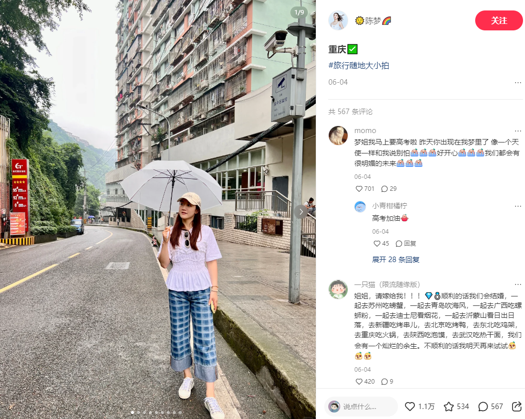 不得不说,陈梦确实十分的漂亮,无论是身材还是穿搭,可能不仅是很多女孩子梦想中的样子,还是很多男孩子梦想中未来对象的“样子”,我们还可以看到在6月份她去到重庆游玩更新的照片!