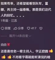 当时就引发了众多网友的思念,“如果有幸,还希望能看到朱军,董卿,再主持一届春晚,那是我们这代人的回忆。。。。”“还是喜欢老一辈的主持人,字正腔圆,不用看字幕就能听清说的啥”。