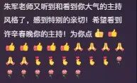 “朱军老师又听到和看到你大气的主持风格了,感到特别的亲切!希望看到许辛春晚你的主持!”