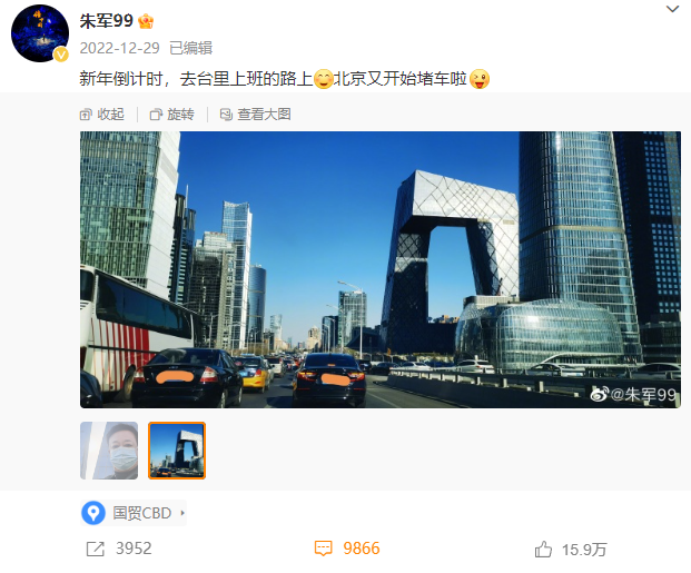 而且在2022年12月29日的时候,朱军在微博上更新了自己的作品,并且文案是,“新年倒计时,去台里上班的路上,北京又开始堵车啦。”
