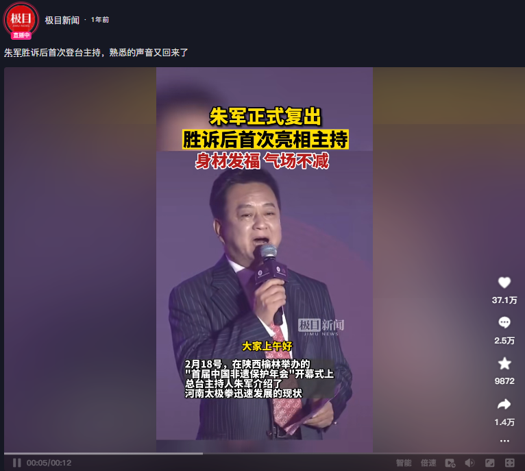 值得一提的是,在大概一年前左右,朱军就在陕西榆林举办的“首届中国非遗保护年会”开幕式上进行了亮相,并且也是总主持人!