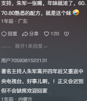 “支持,朱军一张嘴,年味就浓了,60.70.80熟悉的配方,就是这个味”,“著名主持人朱军离开四年后又重返中央电视台,好事儿啊,!正义会迟到但不会缺席欢迎回家。”