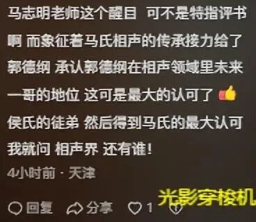 “马志明老师这个醒目,可不是特指评书啊,而象征着马氏相声的传承接力给了郭德纲,承认郭德纲在相声领域里未来一哥的地位,这可是最大的认可了,候氏的徒弟,然后得到马氏的最大认可,我就问,相声界,还有谁!”