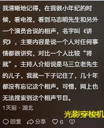 “我清晰的记得,在我很小的时候,看电视,看到马志明先生和另外一个演员合说的相声,名字叫《讲穷》,主要内容就是说一个人对任何事情都很讲究,对比一个人比较“讲就”,主持人介绍说是马三立老先生的儿子,我就一下子记住了,几十年都没有忘记这个相声,可惜,网上也无法搜索到这个相声节目。”