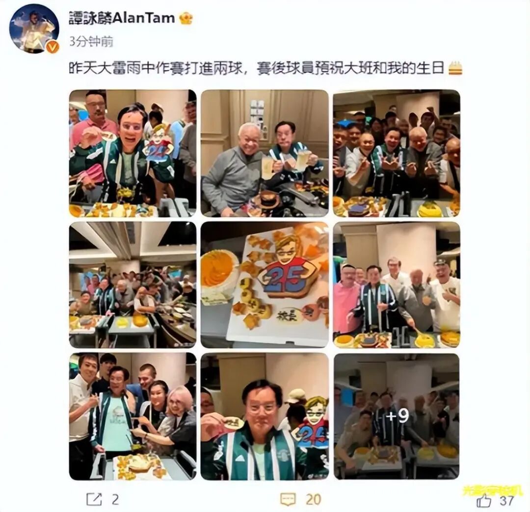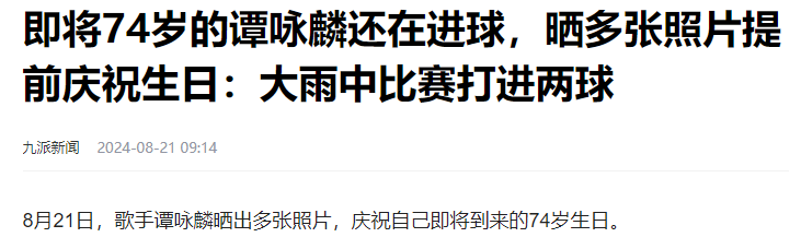 在8月21日的时候,歌手谭咏麟晒出了多张照片,庆祝自己即将到来的74岁生日,并且配着文案“昨天大雨中比赛打进两球,赛后和球员预祝我的生日。”