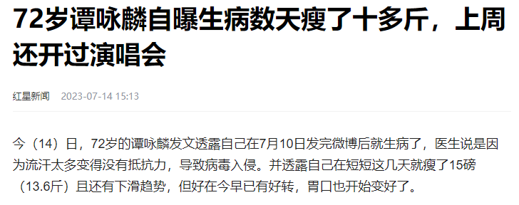 信息来源:红星新闻2023-07-14——72岁谭咏麟自曝生病数天瘦了十多斤,上周还开过演唱会