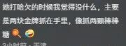 她打哈欠的时候我觉得没什么,主要是两块金牌抓在手里,像抓两根棒棒糖。”
