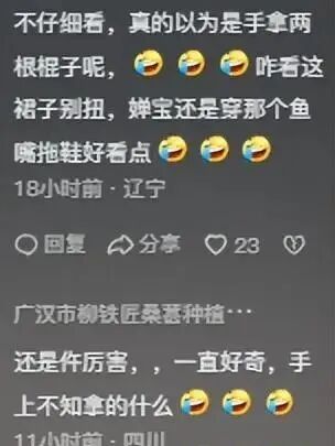 网友们也是很有意思,“不仔细看,真的以为手拿两破棍子呢,咋看这裙子别扭,婵宝还是穿那个鱼嘴拖鞋好看点,”“还是仵厉害,,一直好奇,手上不知拿的什么。”