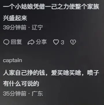 “一个小姑娘凭借一己之力使整个家族兴盛起来,”“人家自己挣的钱,爱买啥买啥,喷子们有什么可说的。”