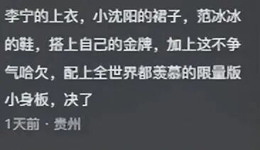 “李宁的上衣,小沈阳的裙子,范冰冰的鞋,搭上自己的金牌,加上这不争气哈欠,配上全世界都羡慕的限量版小身板,绝了。”