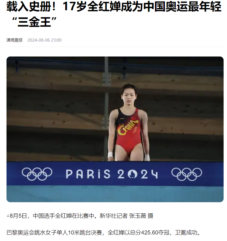 信息来源:潇湘晨报2024-08-06——载入史册!17岁全红婵成为中国奥运最年轻“三金王”