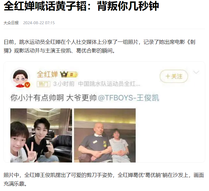 信息来源:大众日报2024-08-22——全红婵喊话黄子韬:背叛你几秒钟