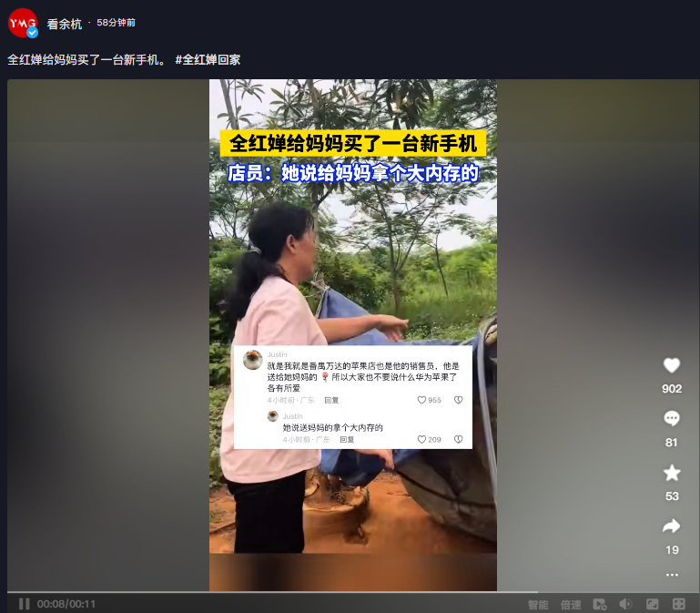 信息来源:看余杭2024年8月22日——全红婵给妈妈买了一台新手机。