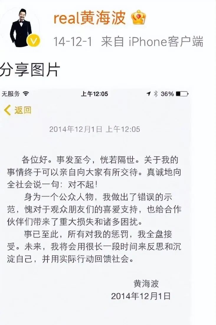 而在2014年11月30日的时候,黄海波收容教育期满被释放,当时他还公开发表了声明进行道歉,紧接着又在2015年上半年的时候,黄海波与曲栅栅秘密结婚,在2015年6月6日凌晨还发布了微博宣布得子。