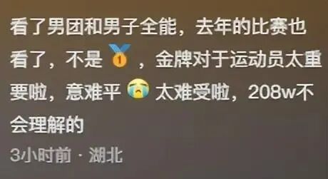 “看了男团和男子全能,去年的比赛也看了,不是金牌,金牌对于运动员来说太重要啦,意难平,太难受了,208W不会理解的。”