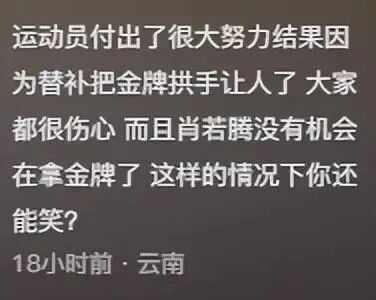 “运动员付出了很大努力结果因为替补把金牌拱手让人了,大家都很伤心,而且肖若腾没有机会再拿金牌了,这样的情况下你还能笑?”