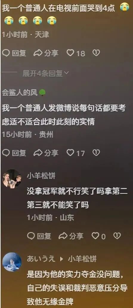 这引发了众多网友的讨论,“我一个普通人在电视前哭到4点,”“我一个普通人发微博说每句话都要考虑适不适合此时此刻的实情”,“没拿冠军就不行笑了吗拿第二第三就不能笑了吗,”“是因为他的实力夺金没问题,自己的失误和裁判恶意压分导致他与冠军无缘。”