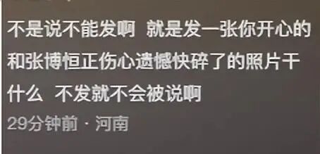 “不是说不能发啊,就是发一张你开心的和张博恒正伤心遗憾快碎了的照片什么,不发就不会被说啊。”