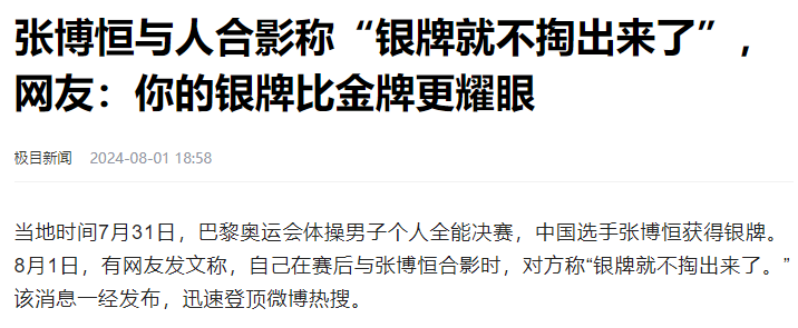 在7月31日的时候,巴黎奥运体操男子个人全能决赛,中国的选手张博恒获得了银牌,在8月1日的时候,有网友发文说到,自己在赛后的时候想和张博恒合影,对方称“银牌就不掏出来了。”