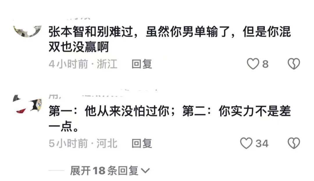 另外,还有的“杀人诛心”的网友在底下评论“安慰”道,“张本智和别难过了,虽然你的男单输了,但是你的混双也没赢啊”。