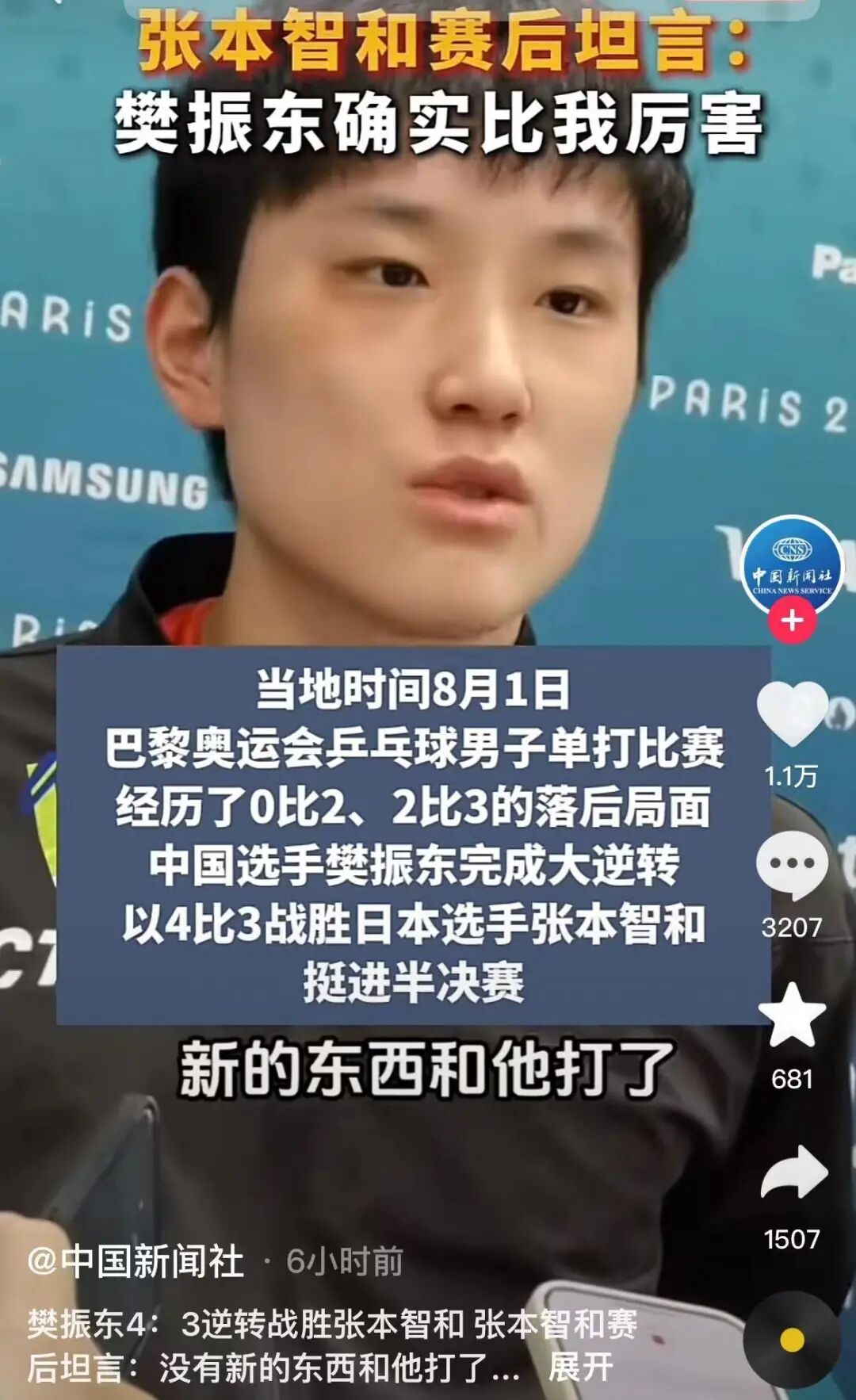 张本智和赛后采访