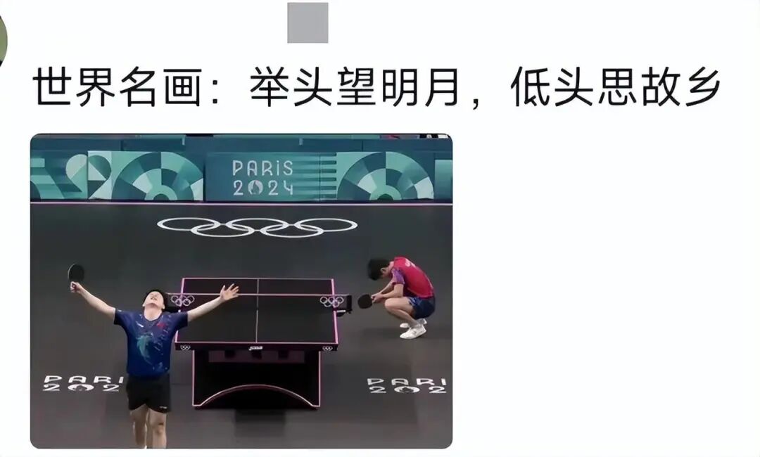 赢了球的樊振东在赛场上仰头张开双臂,而对面输了球的张本智和则落寞地2蹲在地上,这一幕被网友们称之为是“世界名画”,“抬头望明月,低头思故乡”。