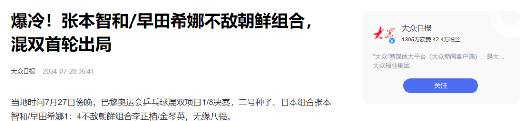 大众日报2024-07-28——爆冷!张本智和/早田希娜不敌朝鲜组合,混双首轮出局