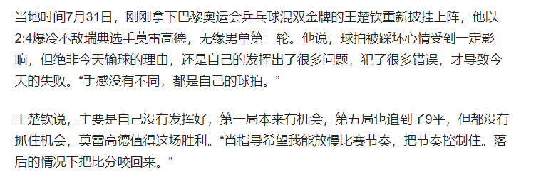 面对这样的结果王楚钦非常自责,接受媒体采访时他表示,虽然心情又被球拍踩坏而受影响,但这也不是今天输球的理由,还是自己发挥有问题。