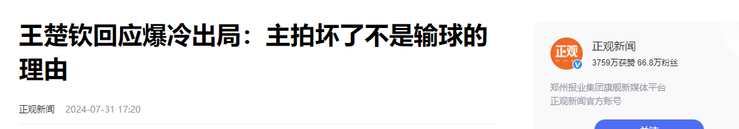 正观新闻2024-07-31——王楚钦回应爆冷出局:主拍坏了不是输球的理由