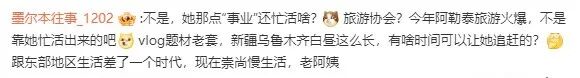 “不是,她那点事业还忙活啥?旅游协会?今年阿勒泰旅游火爆,不是靠她忙活出来的吧,Vlog题材老套,新疆乌鲁木齐白昼这么长,有啥时间可让她追赶的?跟东部地区生活差了一个时代,现在崇尚慢生活,老阿姨。”
