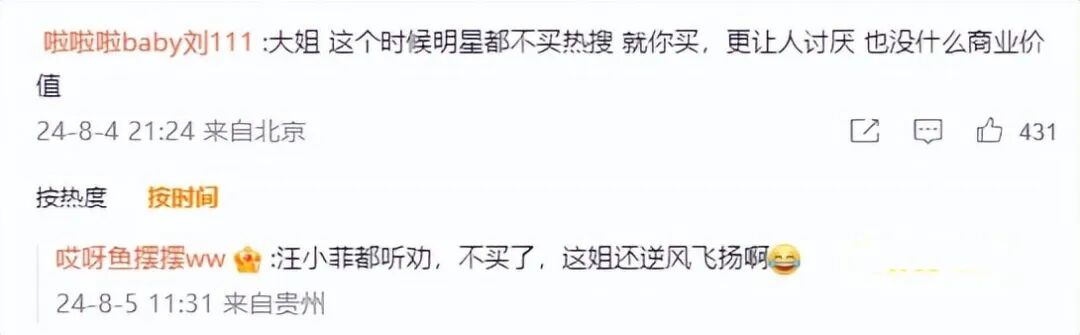 “大姐,这个时候明星都不买热搜,就你买,更让人讨厌,也没什么商业价值,”“汪小菲都听劝,不买了,这姐还逆风飞扬啊。”