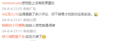 “感觉脸上没有胶原蛋白,”“这得是删了多少评论,好不容易才找到你这条实话,”“她给人感觉就是很装,”“实在太装了。